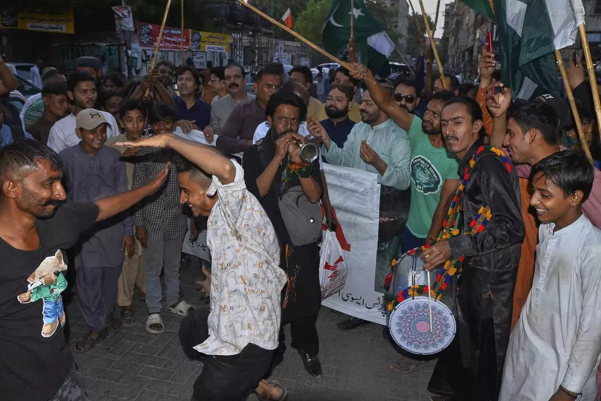People dance on traditional drum beat as they celebrate following India and Pakistan reaching a ceasefire deal, during a demonstration, in Hyderabad, Pakistan, Saturday, May 10, 2025. (AP Photo/Pervez Masih)