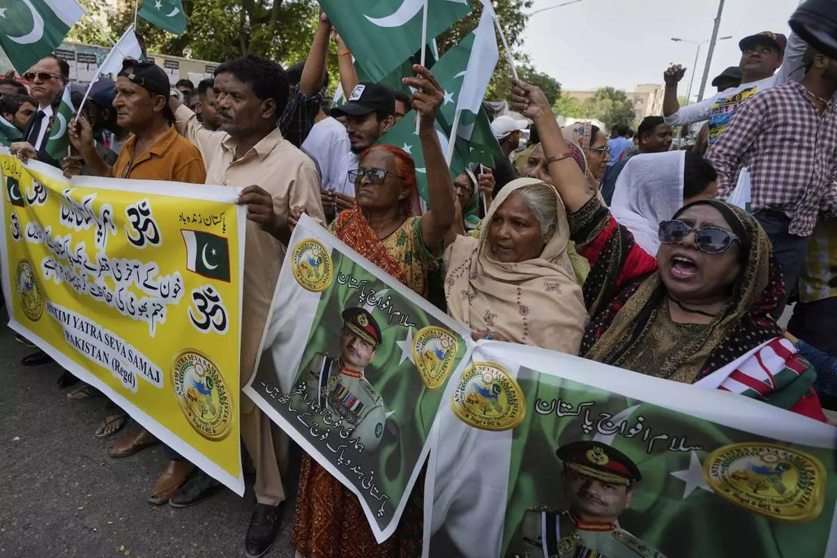 Members of Pakistani Hindu community take part in a demonstration to condemn Indian strikes into Pakistan and to show their support with the Pakistan Army, in Karachi, Pakistan, Saturday, May 10, 2025. (AP Photo/Fareed Khan)