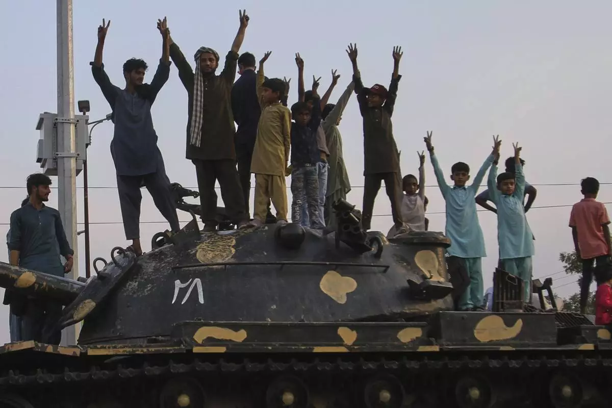Pakistanis flash victory signs as they celebrate on top of a model of a tank following India and Pakistan have reached a ceasefire deal, during a demonstration, in Multan, Pakistan, Saturday, May 10, 2025. (AP Photo/Asim Tanveer)