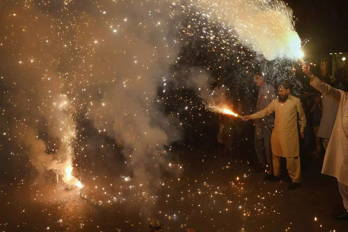 People light fireworks to celebrate Pakistan and India reaching a ceasefire deal, during a demonstration in Hyderabad, Pakistan, Saturday, May 10, 2025. (AP Photo/Pervez Masih)