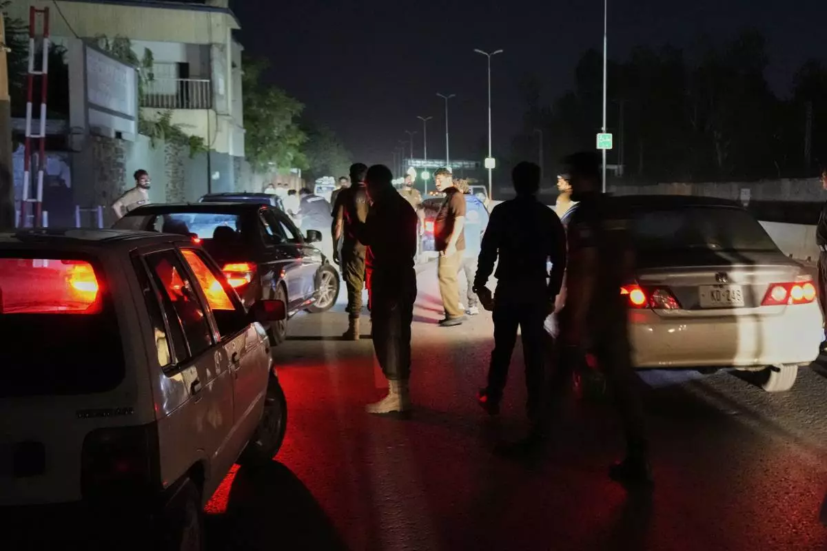 Pakistani police officers remove vehicles and people from the main entry of Nur Khan airbase following an Indian missile strike in Rawalpindi, Pakistan, Saturday, May 10, 2025. (AP Photo/Anjum Naveed)