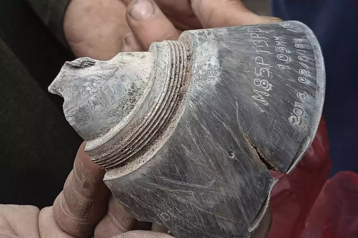 A local resident shows a piece of shell fired by Indian forces, at his damaged house in Haveli Kahuta, a district of Pakistan's administered Kashmir, Friday, May 9, 2025. (AP Photo/Rashid Ahmed)