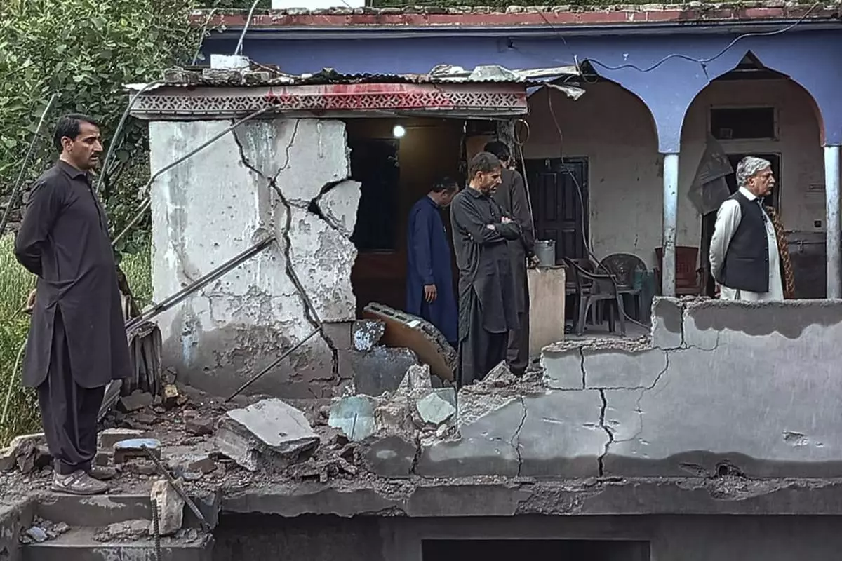 Local residents examine their damaged house following overnight shelling from India, in Haveli Kahuta, a district of Pakistan's administered Kashmir, Friday, May 9, 2025. (AP Photo/Rashid Ahmed)