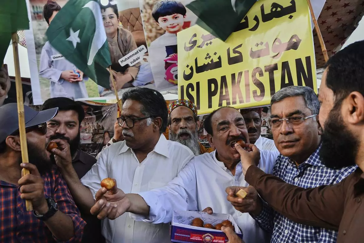 People share sweets as they celebrates following India and Pakistan have reached a ceasefire deal, during a demonstration, in Hyderabad, Pakistan, Saturday, May 10, 2025. (AP Photo/Pervez Masih)