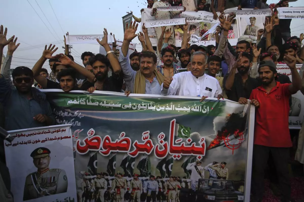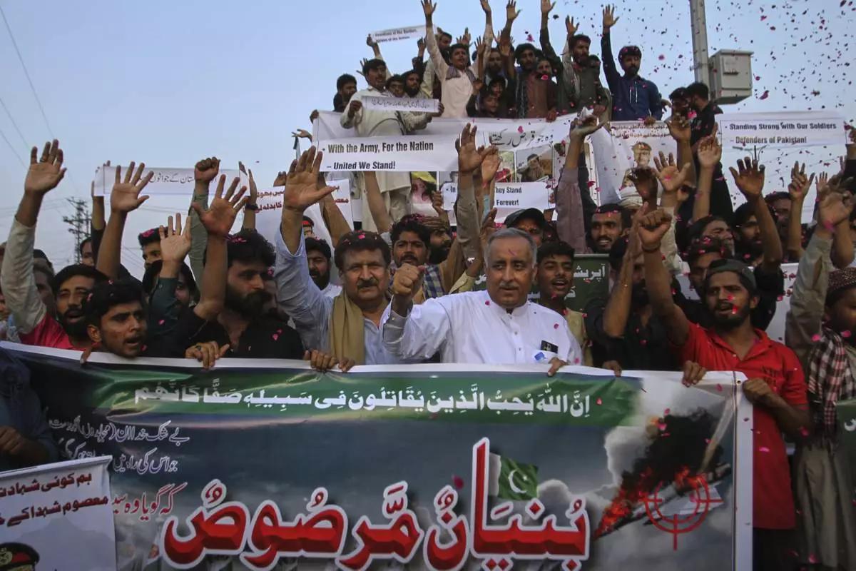 People chant slogans as they celebrates following India and Pakistan have reaching a ceasefire deal, during a demonstration, in Hyderabad, Pakistan, Saturday, May 10, 2025. (AP Photo/Pervez Masih)