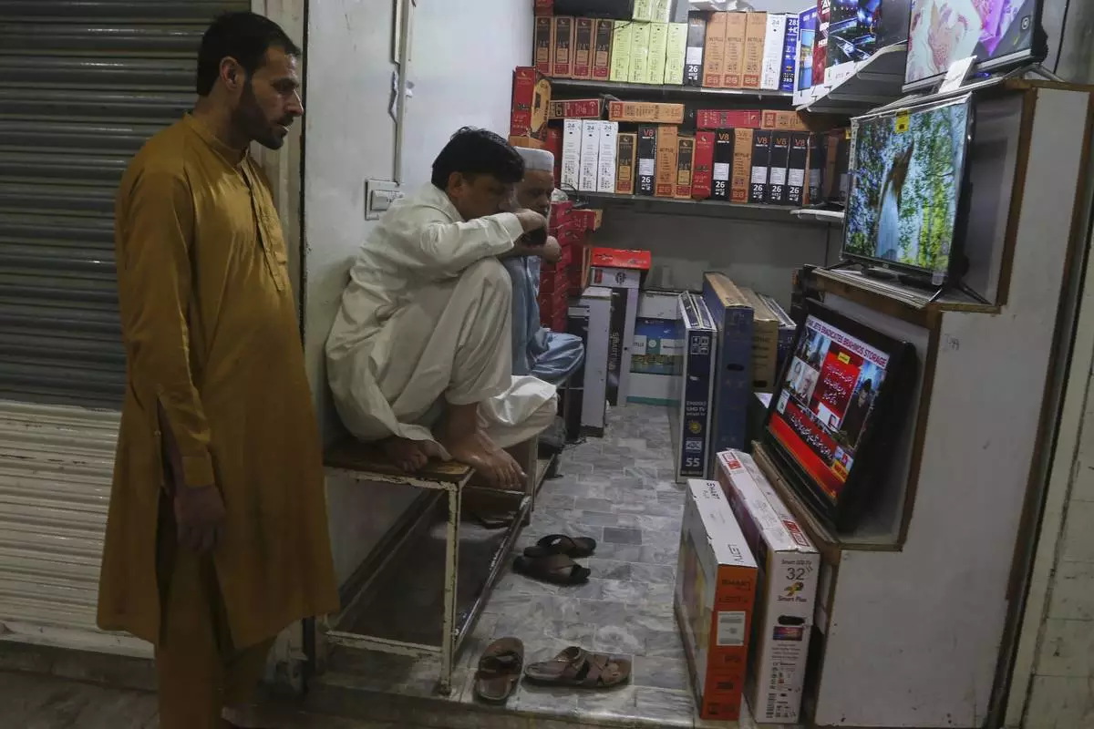 Shopkeepers watch a news channel broadcasting ongoing military tension between Pakistan and India, at a shop in Peshawar, Pakistan, Saturday, May 10, 2025. (AP Photo/Muhammad Sajjad)
