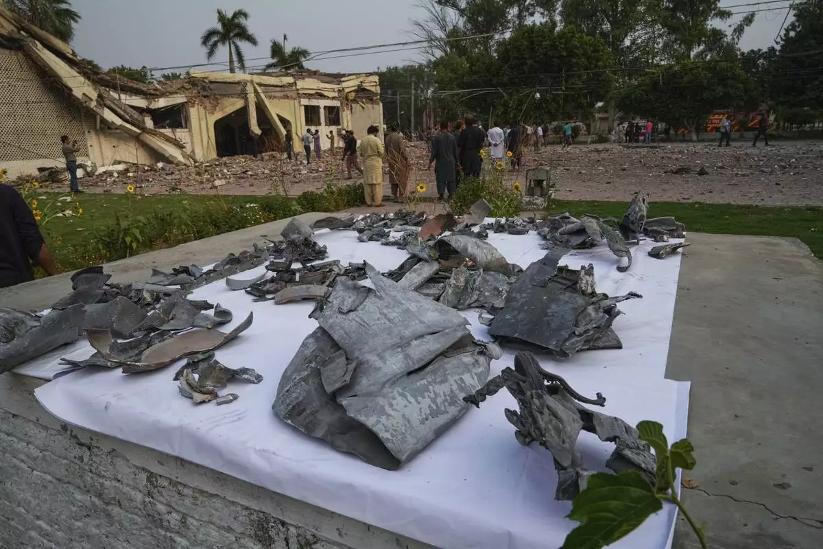 Metal pieces of suspected Indian missiles lie on the compound of a mosque building damaged by Indian missile attack, in Muridke, a town in Pakistan's Punjab province, Wednesday, May 7, 2025. (AP Photo/K.M. Chaudary)