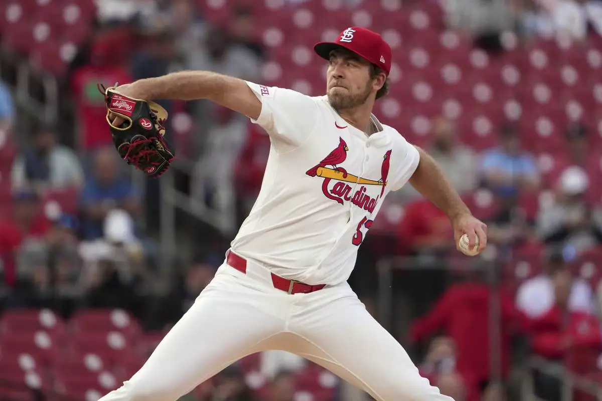 St. Louis Cardinals starting pitcher Matthew Liberatore throws during the first inning of a baseball game against the Pittsburgh Pirates Tuesday, May 6, 2025, in St. Louis. (AP Photo/Jeff Roberson)