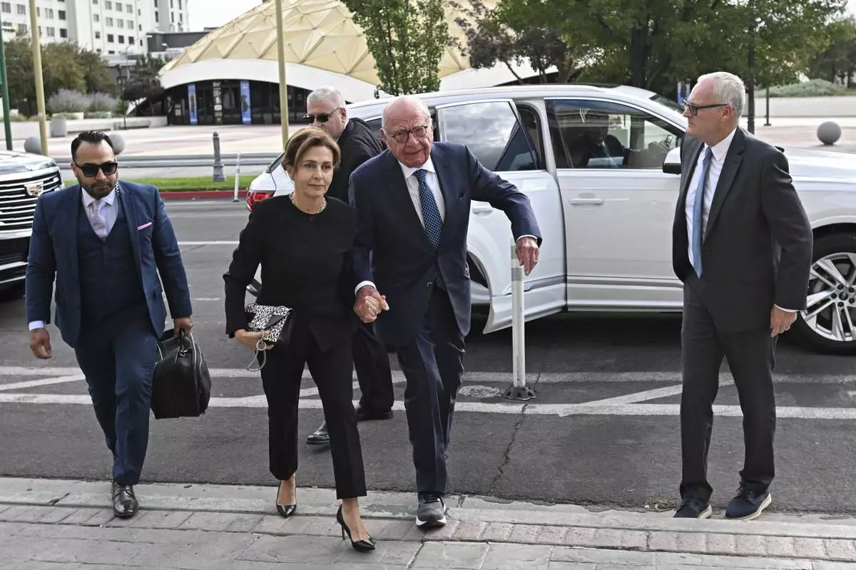 FILE - Rupert Murdoch, center, and his wife Elena Zhukova Murdoch arrive at the Second Judicial District Court in Reno, Nev., Monday Sept. 16, 2024. (AP Photo/Andy Barron, File)
