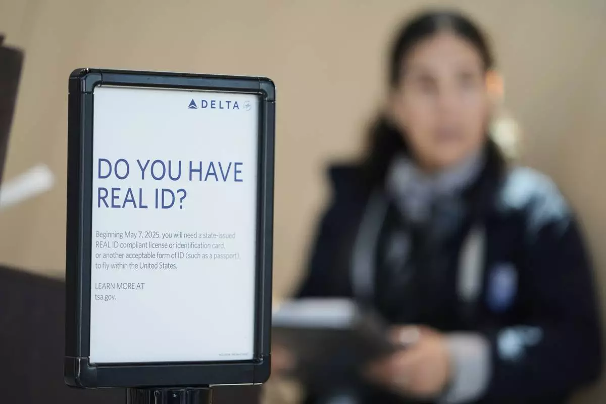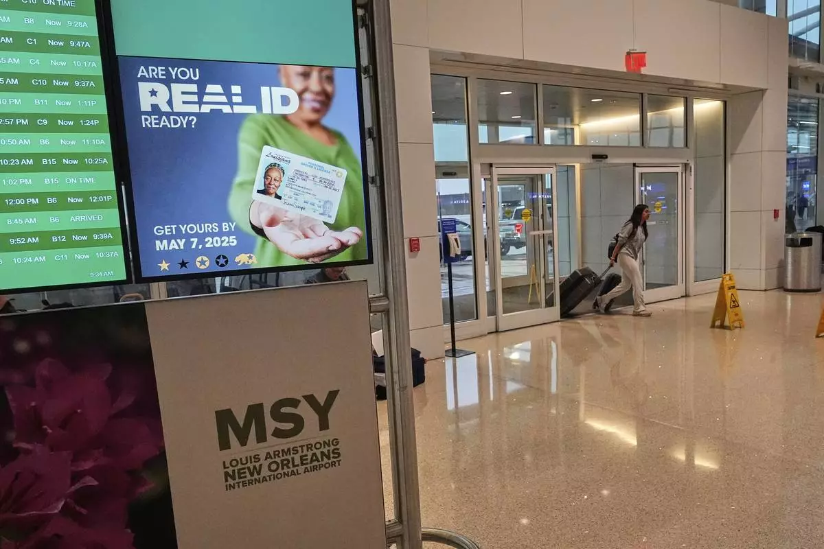 Signage reminds travelers of the new Real ID mandate at Louis Armstrong New Orleans International Airport in Kenner, La., the first day Real ID is implemented for commercial airline travel, Wednesday, May 7, 2025. (AP Photo/Gerald Herbert)