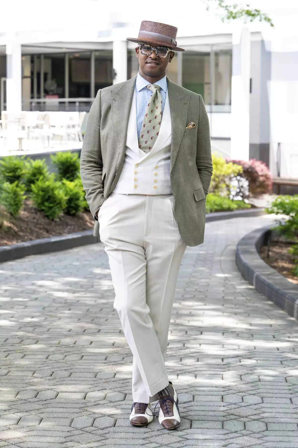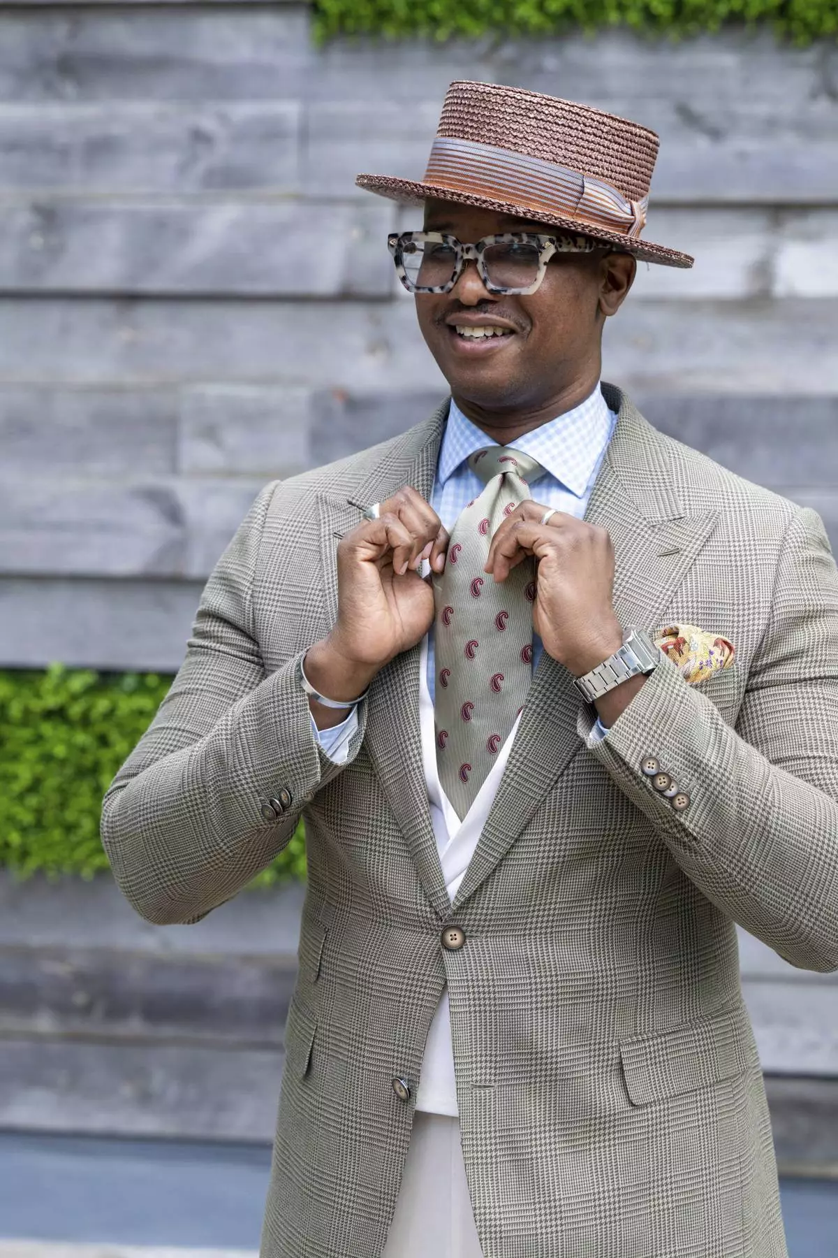 “Texture is the must-have when you start talking about dandyism — textures and patterns. The great point here is that dandies always have their thing. And so, for me, hats are my thing,” Andrew said, adding that small accessories, like stylish wool or cashmere socks and pocket squares, can easily elevate a look. “Now, it’s starting to become glasses. … Every dandy has the opportunity to utilize something.”