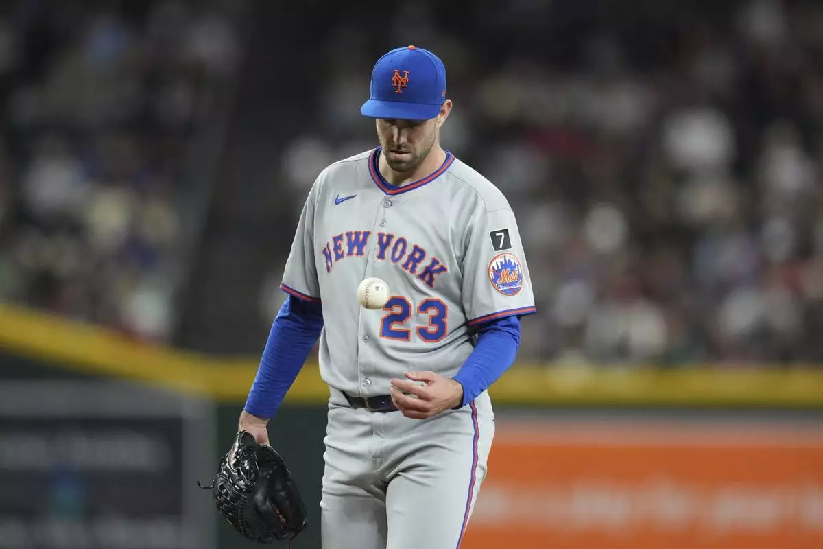 New York Mets starting pitcher David Peterson flips a new ball in the air after giving up a two-run home run to Arizona Diamondbacks' Lourdes Gurriel Jr. during the sixth inning of a baseball game Tuesday, May 6, 2025, in Phoenix. (AP Photo/Ross D. Franklin)