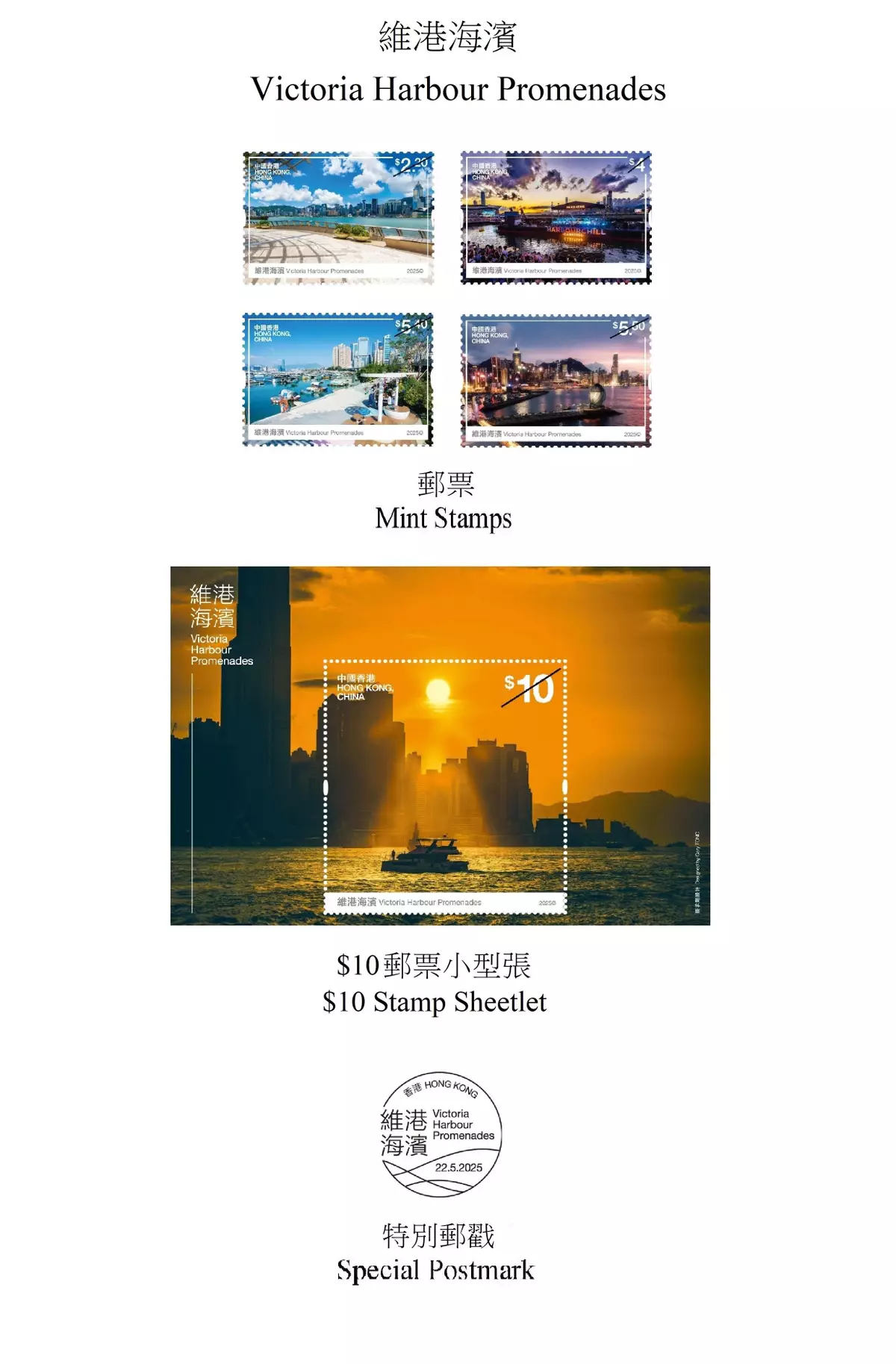Hongkong Post announced today (May 7) that a set of special stamps and associated philatelic products on the theme of "Victoria Harbour Promenades" will be released for sale on May 22 (Thursday).