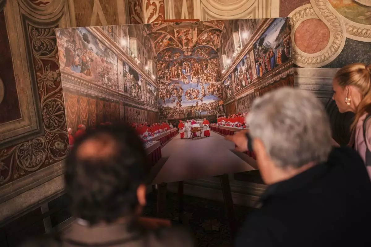 Journalists look at a photograph of the conclave where late Pope Francis was elected on March 13, 2013, and displayed inside the Borgia Apartments at the Vatican Museums during a press tour, Friday, May 2, 2025. (AP Photo/Francisco Seco)