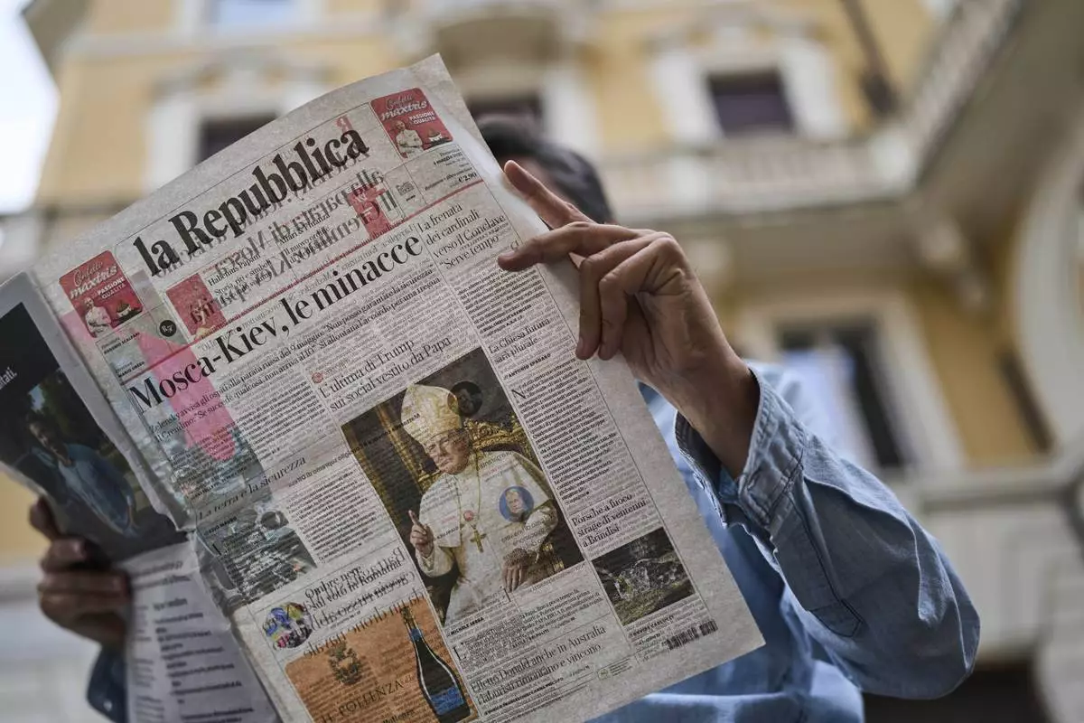 The intelligence-generated image of President Donald Trump dressed as pope fills the front-page of an Italian newspaper in Rome, Sunday, May 4, 2025. (AP Photo/Bernat Armangue)