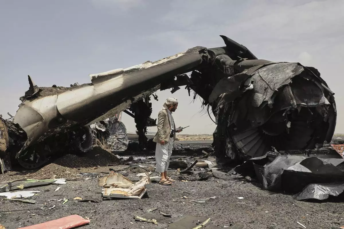 A Yemeni officer inspects the wreckage of a destroyed civilian aircraft following Israeli airstrikes on Sanaa International Airport in Sanaa, Yemen, Wednesday, May 7, 2025. (AP Photo/Osamah Abdulrahman)