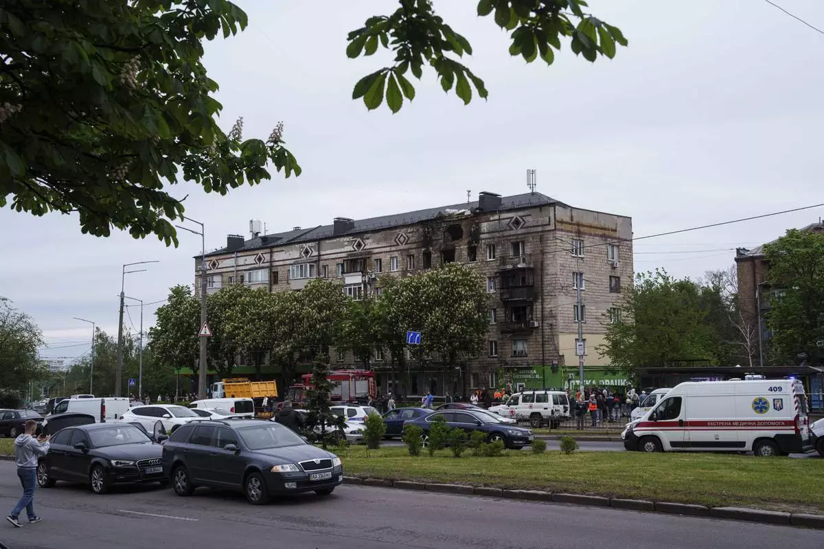 A residential building is seen damaged after a Russian strike in Kyiv, Ukraine, on Wednesday, May 7, 2025. (AP Photo/Evgeniy Maloletka)