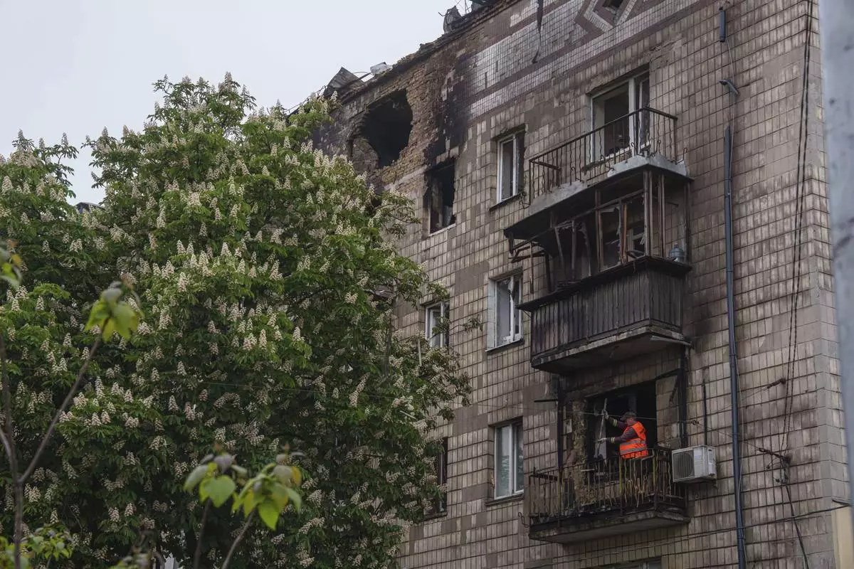 A municipal worker clear the rubble from a balcony of a residential building damaged after a Russian strike in Kyiv, Ukraine, on Wednesday, May 7, 2025. (AP Photo/Evgeniy Maloletka)