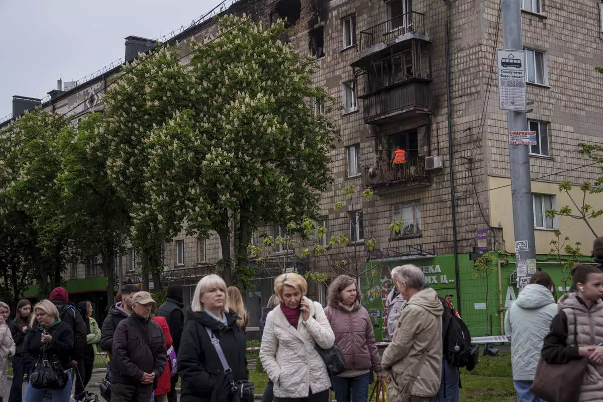 Local residents wait for a tram in front of a residential building, damaged after a Russian strike, in Kyiv, Ukraine, on Wednesday, May 7, 2025. (AP Photo/Evgeniy Maloletka)