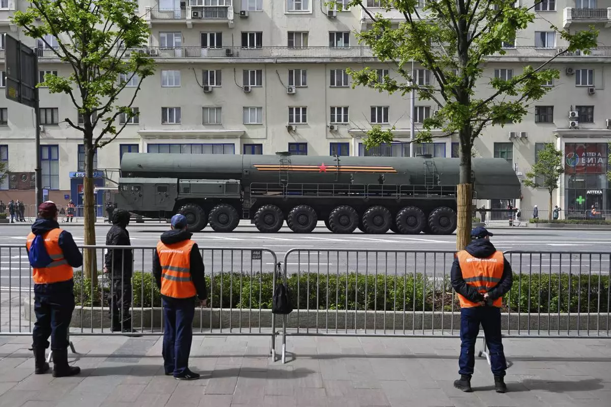 A Russian RS-24 Yars ballistic missile launcher rolls along the Garden Ring after the Victory Day military parade general rehearsal in Moscow, Russia, Wednesday, May 7, 2025. (AP Photo/Dmitry Serebryakov)