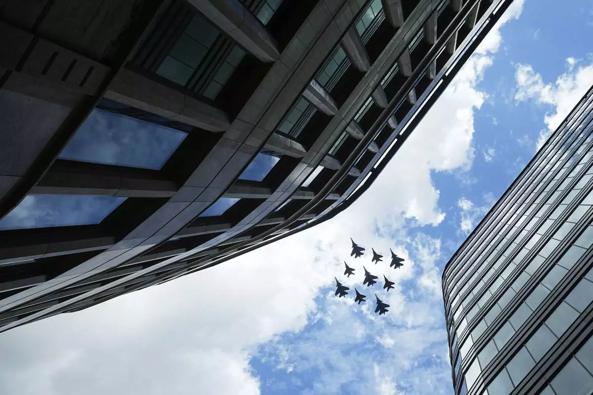 Russian Sukhoi Su-30SM jet fighters of The Russian Knights aerobatic team and Mikoyan MiG-29 jet fighters of The Swifts aerobatic team fly towards the Red Square for the Victory Day military parade general rehearsal in Moscow, Russia, Wednesday, May 7, 2025. (AP Photo/Pavel Bednyakov)
