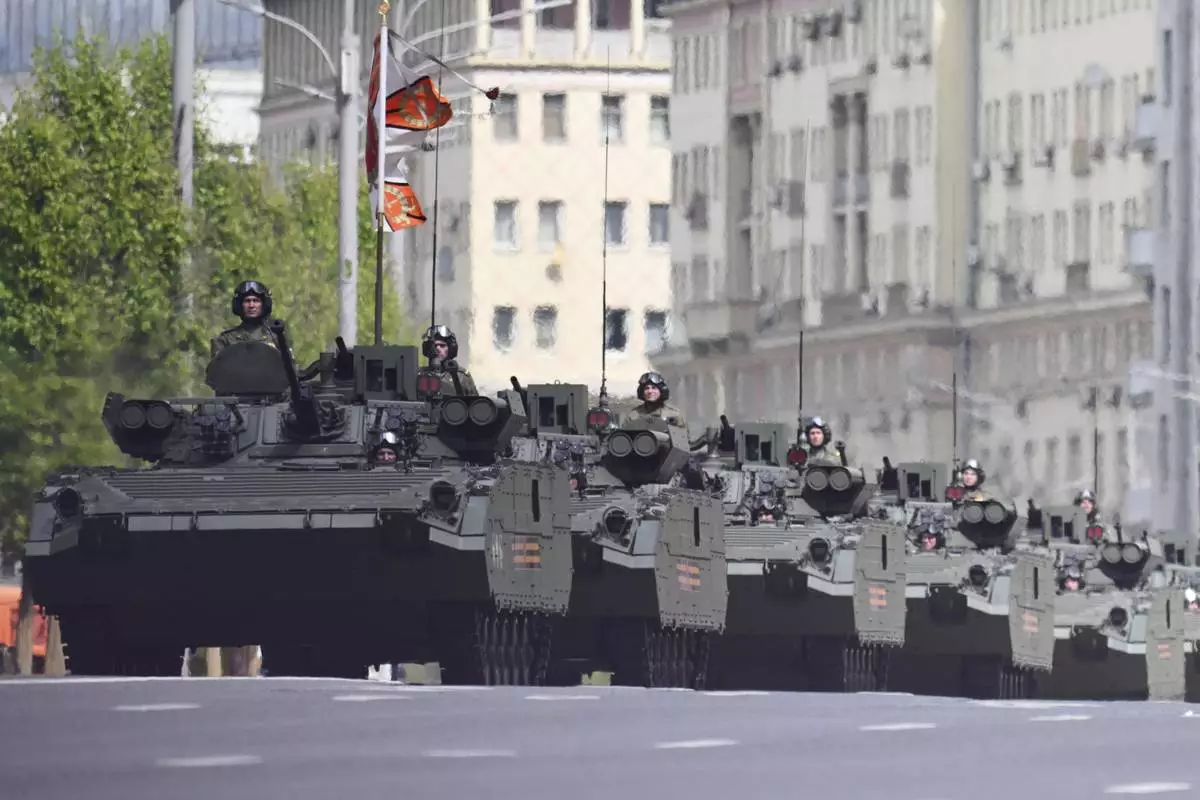 Russian BMP-2 infantry fighting vehicles roll along the Garden Ring after the Victory Day military parade general rehearsal in Moscow, Russia, Wednesday, May 7, 2025. (AP Photo/Dmitry Serebryakov)