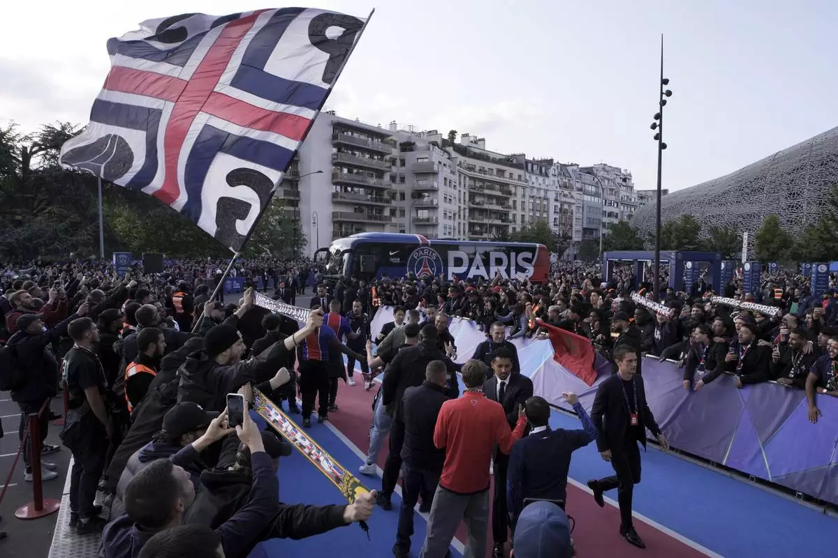 Fans welcome PSG players ahead of the Champions League semifinal, second leg soccer match between Paris Saint-Germain and Arsenal at the Parc des Princes in Paris, Wednesday, May 7, 2025. (AP Photo/Aurelien Morissard)