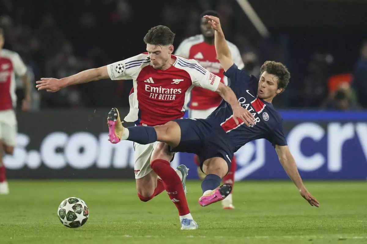 PSG's Joao Neves, right, challenges Arsenal's Declan Rice during the Champions League semifinal, second leg soccer match between Paris Saint-Germain and Arsenal at the Parc des Princes in Paris, Wednesday, May 7, 2025. (AP Photo/Thibault Camus)
