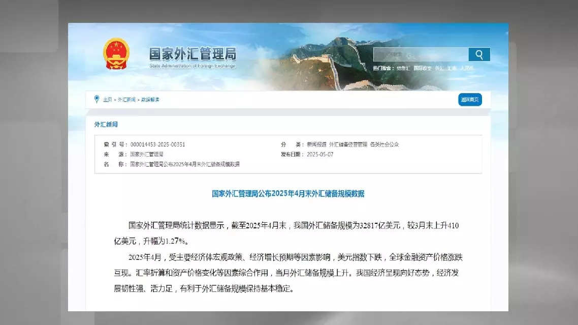 China's foreign exchange reserves totaled 3.2817 trillion U.S. dollars at the end of April 2025, up by 41 billion U.S. dollars, or 1.27 percent, compared with the end of March, according to a statement released by China's State Administration of Foreign Exchange on Wednesday.