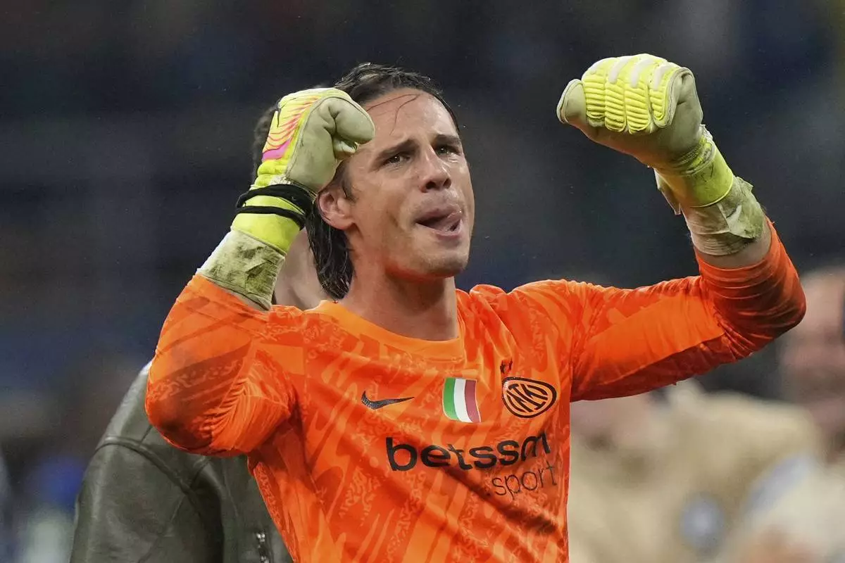 Inter Milan's goalkeeper Yann Sommer celebrates at the end of the Champions League semifinal second leg soccer match between Inter Milan and Barcelona at San Siro stadium in Milan , Italy, Tuesday, May 6, 2025. (AP Photo/Luca Bruno)