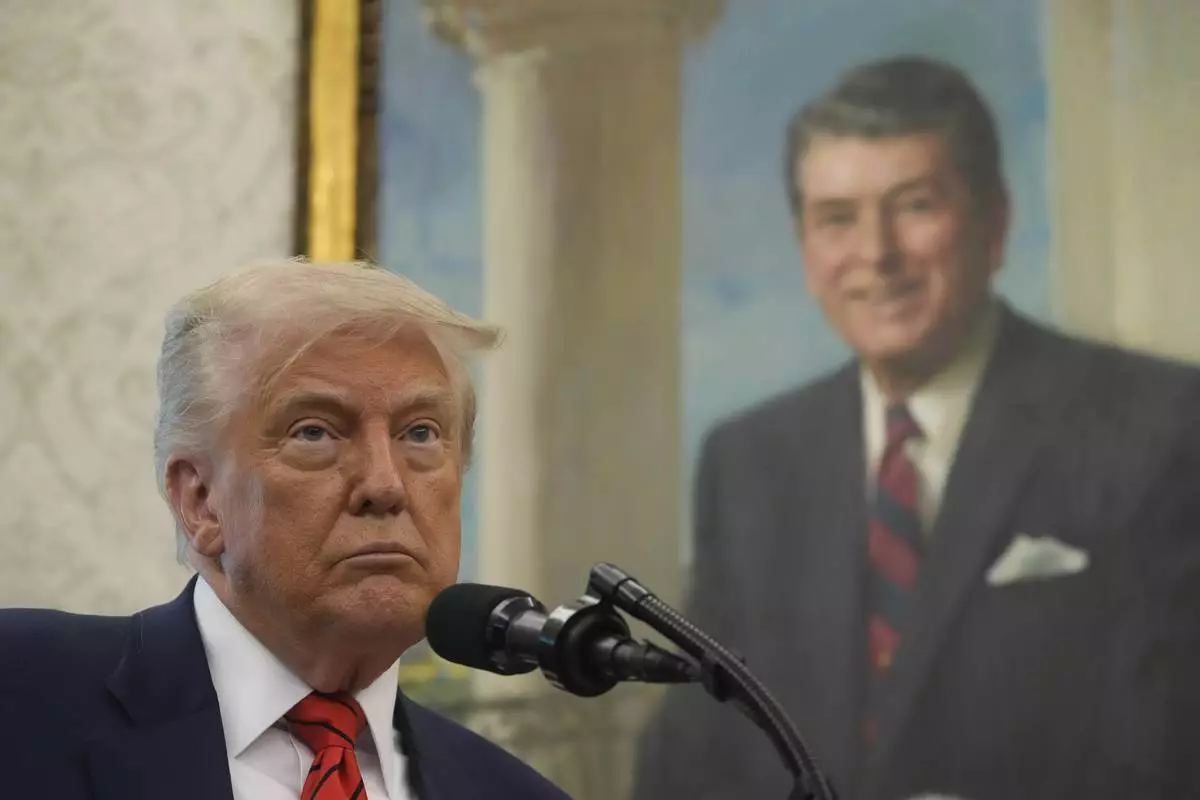 President Donald Trump speaks before Steve Witkoff is sworn as special envoy during a ceremony in the Oval Office of the White House, Tuesday, May 6, 2025, in Washington, with a portrait of former President Ronald Reagan in the background. (AP Photo/Mark Schiefelbein)