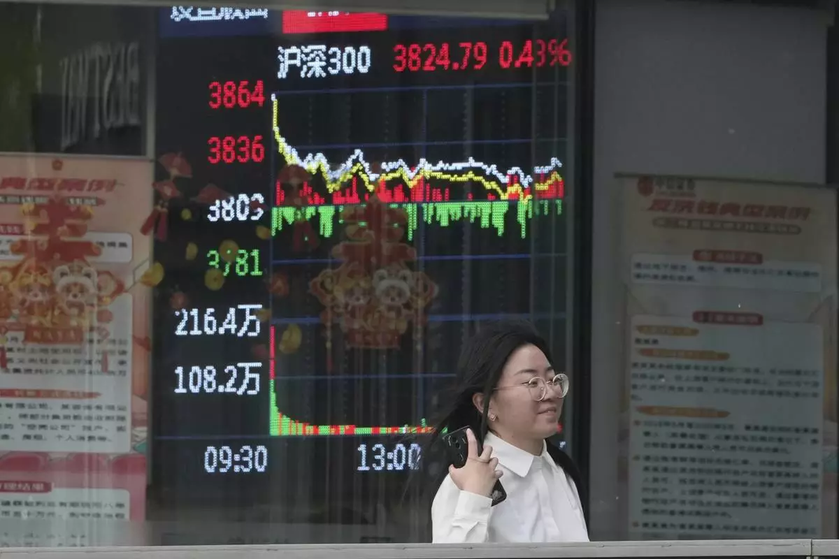 A woman passes by a stock index at a brokerage in Beijing, Wednesday, May 7, 2025. (AP Photo/Ng Han Guan)