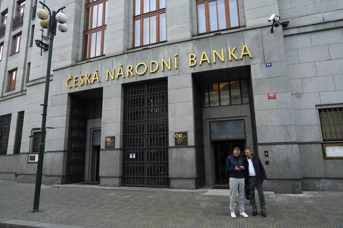 FILE - People stand outside the Czech central bank in Prague, Czech Republic, Thursday, Nov. 2, 2023. (AP Photo/Petr David Josek, File)