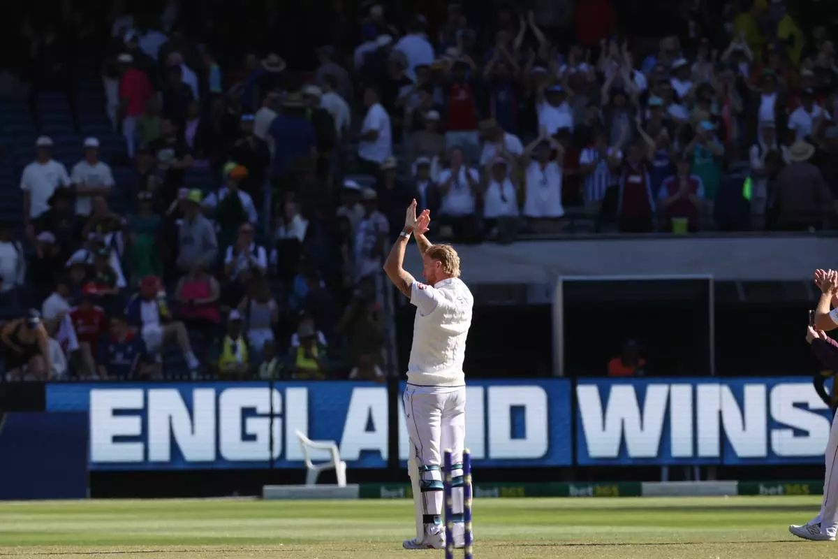 England's Ben Stokes applauds the crowd after England defeated Australia on Day 2 of their Ashes cricket test match in Melbourne, Saturday, Dec. 27, 2025. (AP Photo/Hamish Blair)