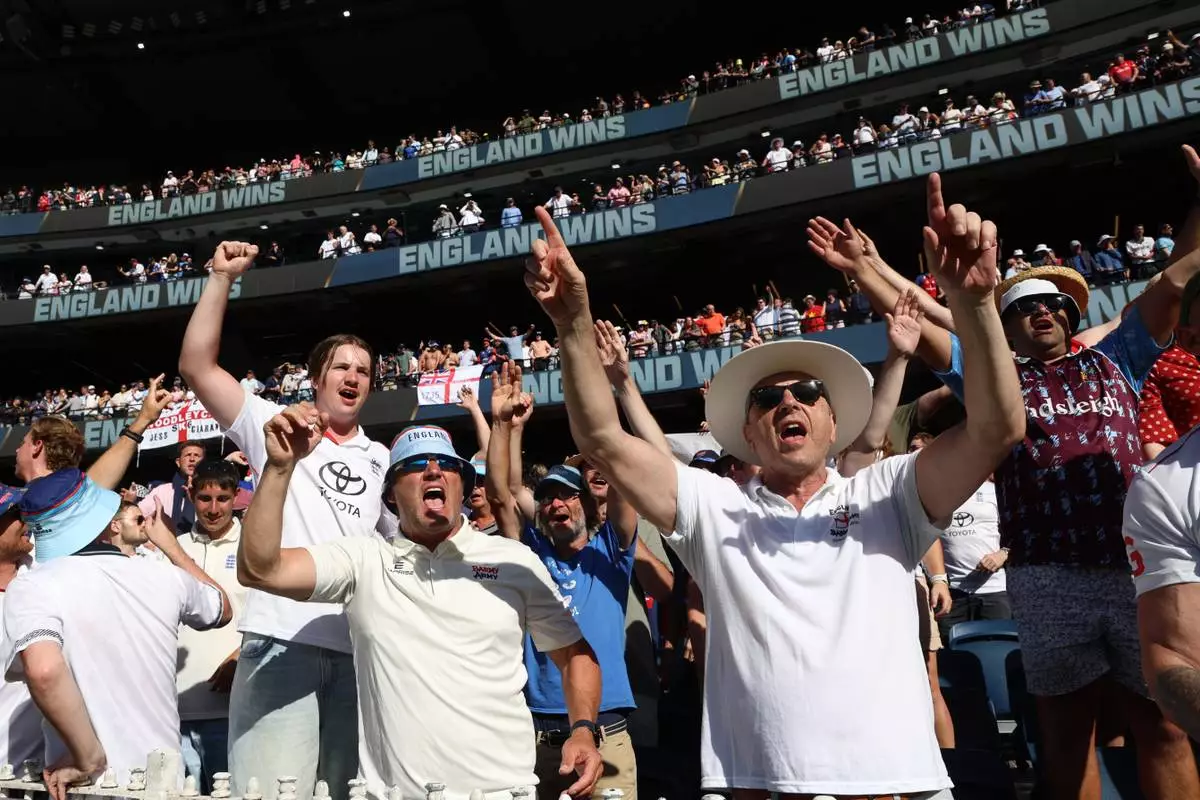 Fans celebrate England's win over Australia on Day 2 of their Ashes cricket test match in Melbourne, Saturday, Dec. 27, 2025. (AP Photo/Hamish Blair)