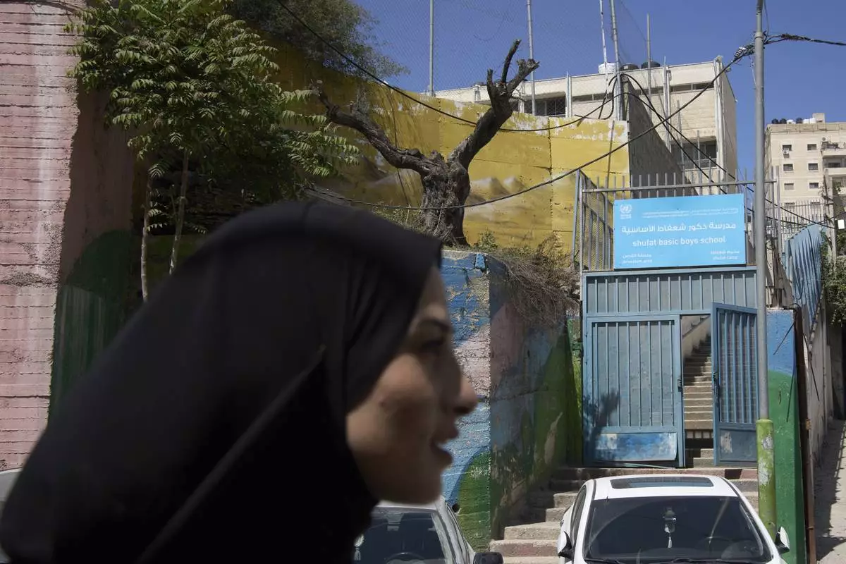 A woman passes the front entrance to the UNRWA Boys' School run by the U.N. agency for Palestinian refugees in the Shuafat Refugee Camp in east Jerusalem, Tuesday, April 29, 2025. (AP Photo/Maya Alleruzzo)