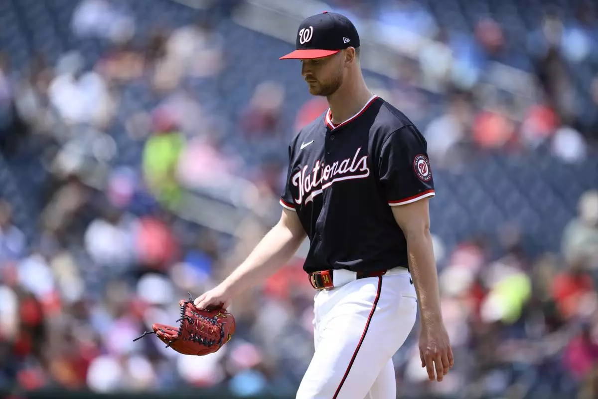 Washington Nationals starting pitcher Michael Soroka walks back to the dugout after he was pulled during the sixth inning of a baseball game against the Cleveland Guardians, Wednesday, May 7, 2025, in Washington. (AP Photo/Nick Wass)