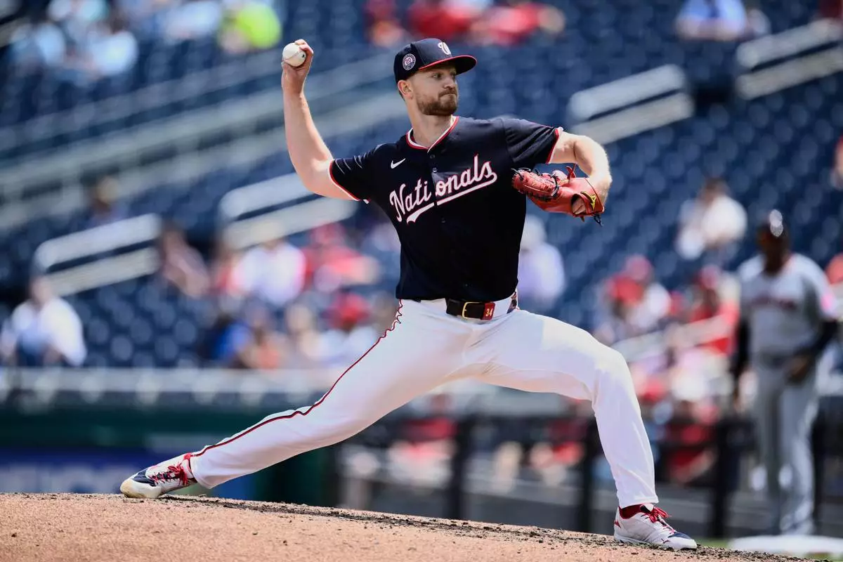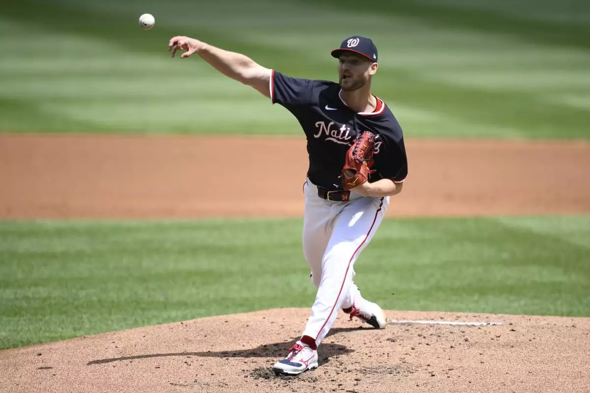 Washington Nationals starting pitcher Michael Soroka throws during the first inning of a baseball game against the Cleveland Guardians, Wednesday, May 7, 2025, in Washington. (AP Photo/Nick Wass)
