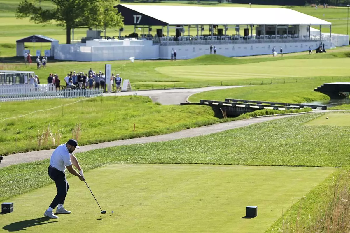 Former Philadelphia Eagles football player Jason Kelce hits on the 17th hole during a pro-am before the Truist Championship golf tournament at the Philadelphia Cricket Club, Wednesday, May 7, 2025, in Flourtown, Pa. (AP Photo/Matt Rourke)