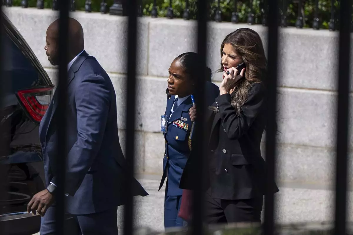 Homeland Security Secretary Kristi Noem, right, walks to the White House, Wednesday, April 30, 2025, in Washington. (AP Photo/Alex Brandon)