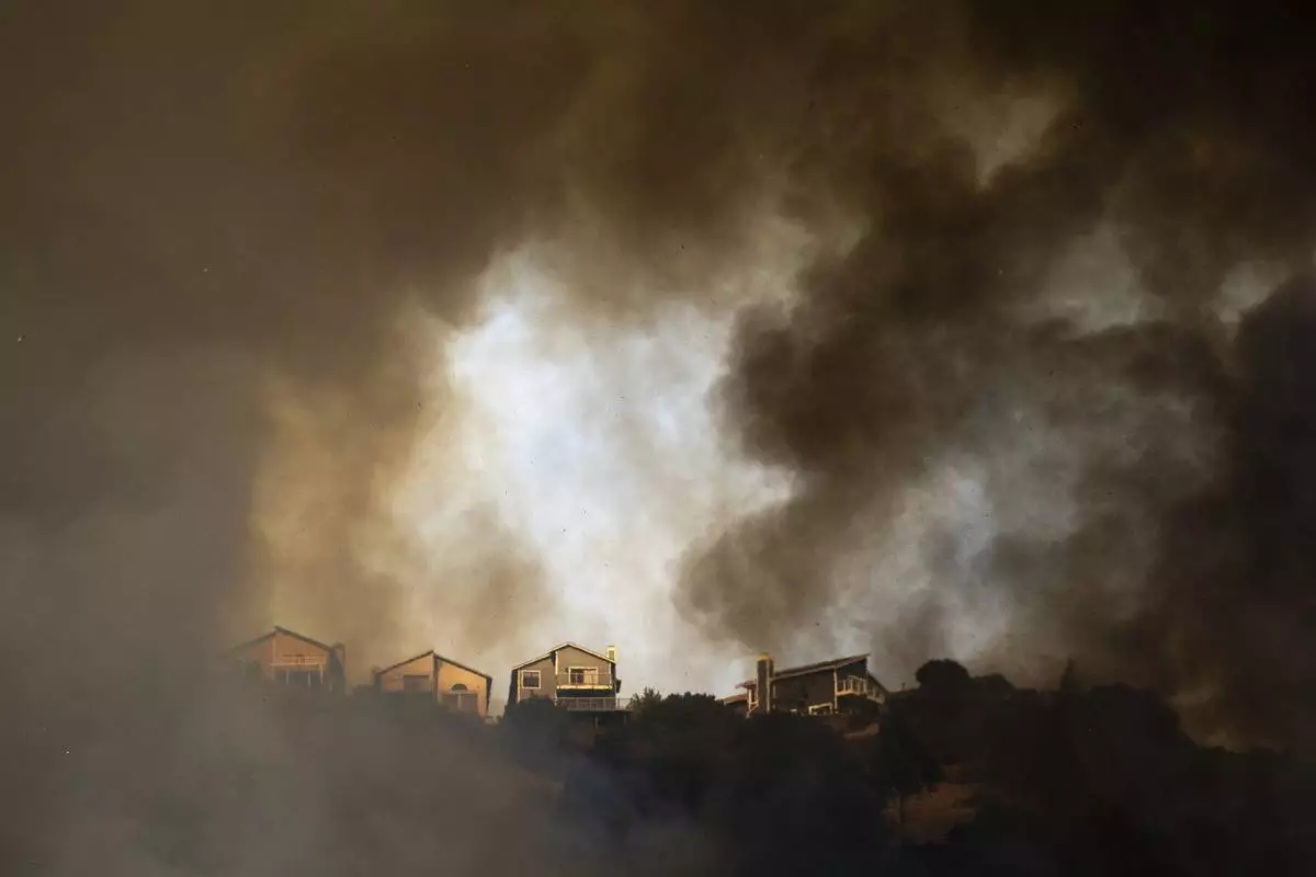 FILE - Smoke rises above homes as a grass fire burns near Interstate 580 in Oakland, Calif., Friday, Oct. 18, 2024. (AP Photo/Noah Berger, File)