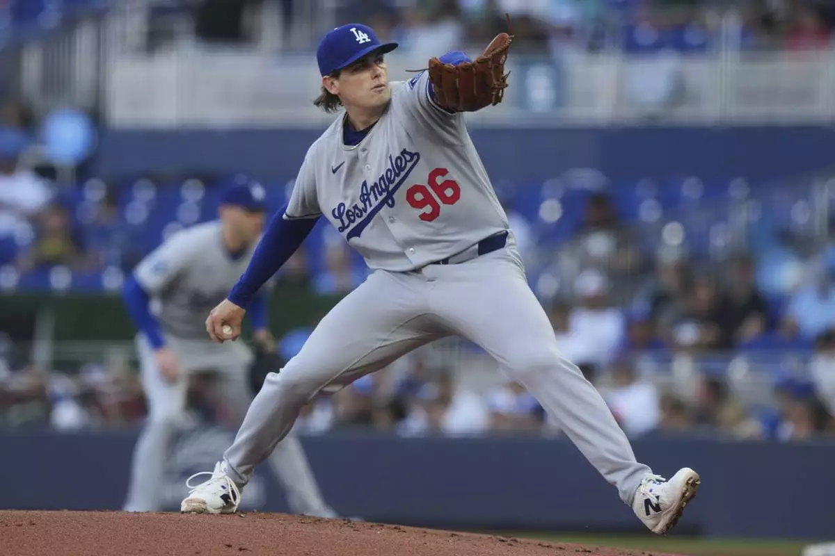 Los Angeles Dodgers pitcher Landon Knack (96) aims a pitch during the first inning of a baseball game against the Miami Marlins, Wednesday, May 7, 2025, in Miami. (AP Photo/Marta Lavandier)