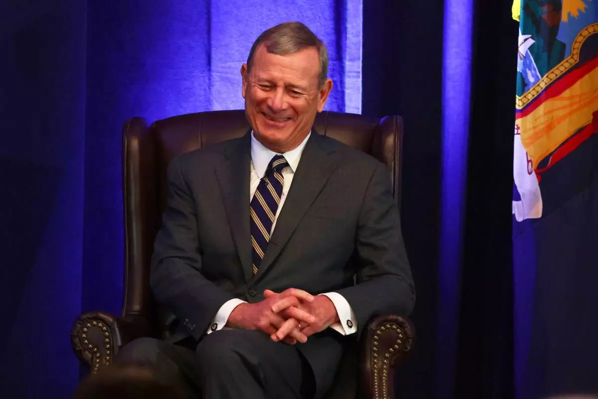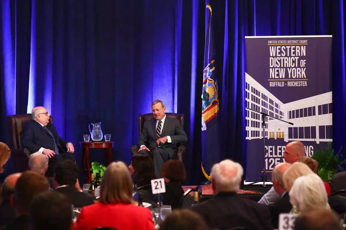 Chief Justice John Roberts speaks during a fireside chat at the 125th anniversary celebration of the United States District court for the Western District of New York, Wednesday, May 7, 2025, in Buffalo, N.Y. (AP Photo/Jeffrey T. Barnes)