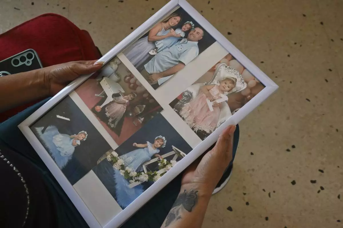 Heidy Sánchez, who was deported from the US to Cuba, holds photos of her daughter and husband, a US citizen, at her home in Havana, Tuesday, May 6, 2025. (AP Photo/Jorge Luis Baños)