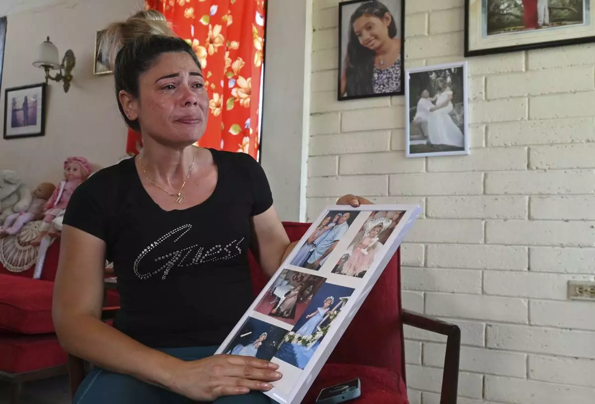 Heidy Sánchez, who was deported from the US to Cuba, cries while showing photos of her daughter and husband, a US citizen, at her home in Havana, Tuesday, May 6, 2025. (AP Photo/Jorge Luis Baños)