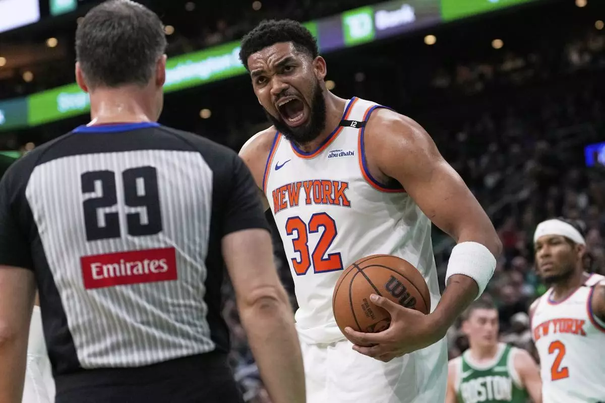 New York Knicks center Karl-Anthony Towns (32) argues a call with referee Mark Lindsay (29) during the first half of Game 2 of an NBA basketball second-round playoff series against the Boston Celtics, Wednesday, May 7, 2025, in Boston. (AP Photo/Charles Krupa)