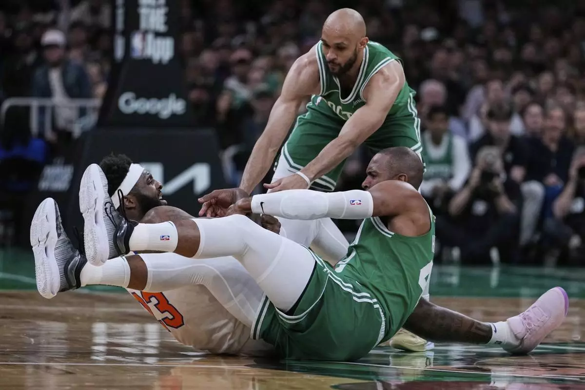 Boston Celtics center Al Horford, lower right, and guard Derrick White battle New York Knicks center Mitchell Robinson (23) for the ball during the first half of Game 2 of an NBA basketball second-round playoff series, Wednesday, May 7, 2025, in Boston. (AP Photo/Charles Krupa)