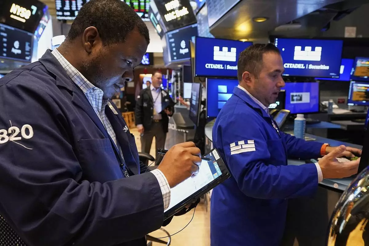 Specialist Gregg Maloney, left, works on the floor of the New York Stock Exchange, Wednesday, May 7, 2025. (AP Photo/Richard Drew)