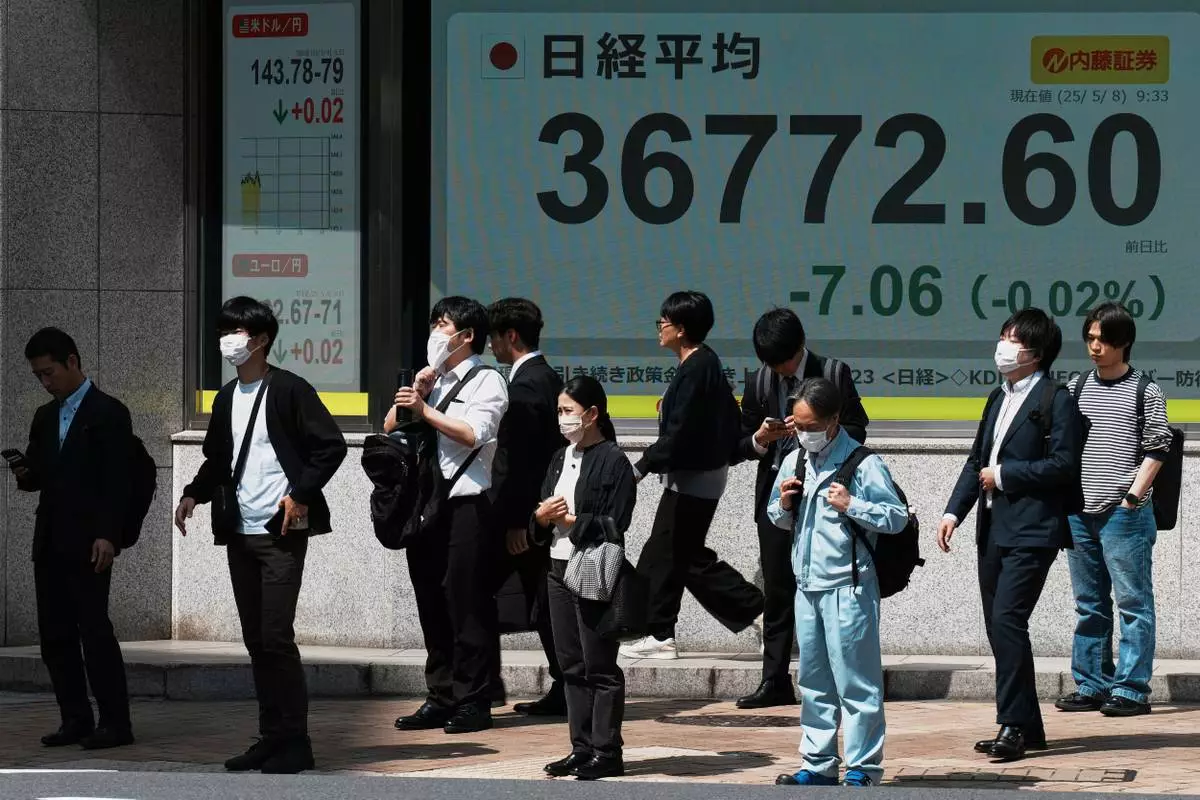 People walk in front of an electronic stock board showing Japan's Nikkei index at a securities firm Thursday, May 8, 2025, in Tokyo. (AP Photo/Eugene Hoshiko)