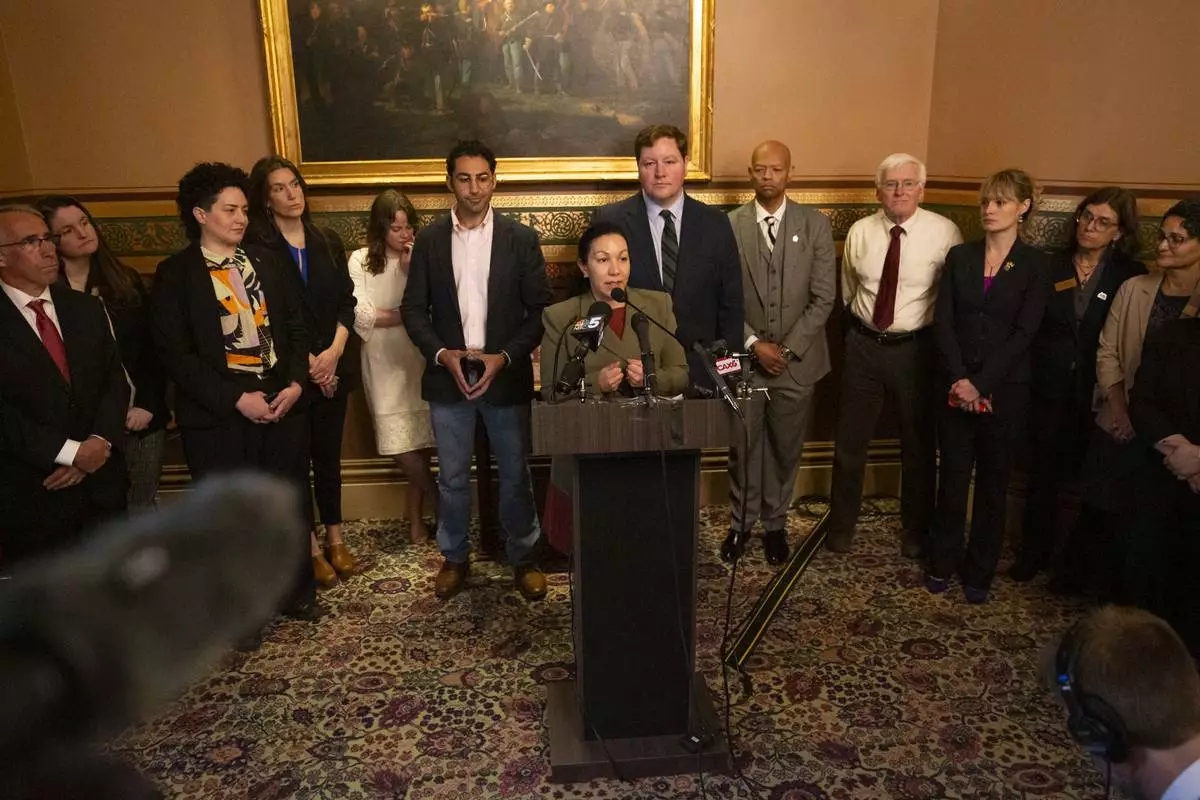 Vermont state Sen. Kesha Ram Hinsdale, D-Montpelier, center, speaks during a news conference announcing the launch of the Vermont Immigration Legal Defense Fund in the Cedar Creek Reception Room at the Vermont State House on Thursday, May 8, 2025, in Montpelier, Vt. (AP Photo/Alex Driehaus)